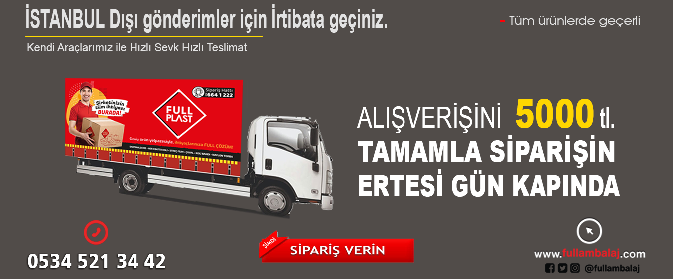 Ambalaj sektöründe kaliteli, dayanıklı ve ekonomik ürünlere ulaşmak isteyenler için Full Ambalaj, geniş ürün yelpazesi ve profesyonel hizmet anlayışıyla öne çıkan bir tedarikçidir. Online satış platformumuz fullambalaj.com, bireysel ve kurumsal müşteriler için ihtiyaç duyulan tüm ambalaj malzemelerini, hızlı teslimat ve uygun fiyat avantajıyla sunar.
